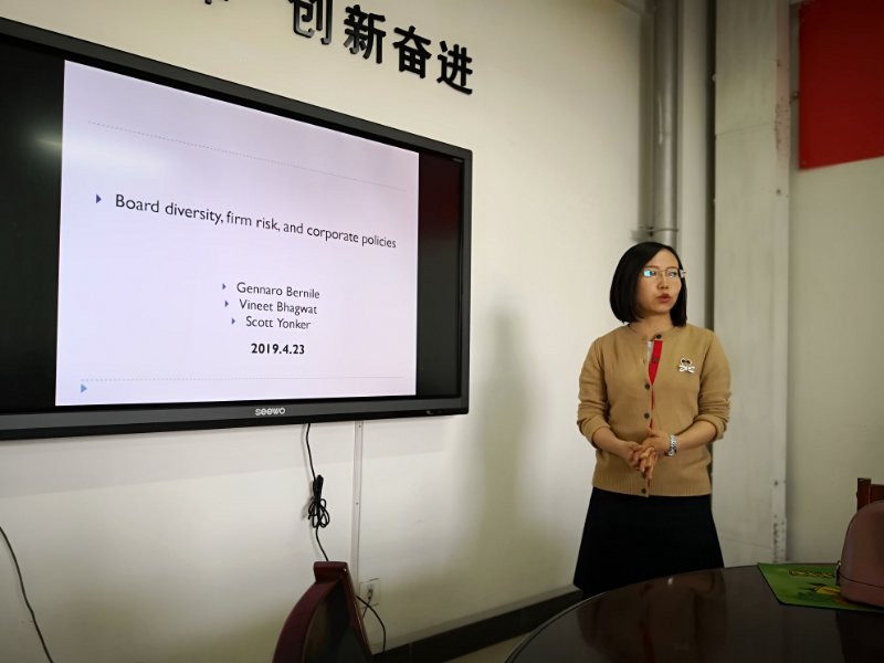 2019年4月23日下午,304永利集团官网入口学院学术论坛由贺亚楠博士向全院师生讲解2016年发表在JFE上的一篇论文《Board diversity,firm risk and corporate policies》。文章背景是源于近年来公司董事会的多样性受到了政治和媒体的广泛关注,但此前研究大多数侧重多样性的某个方面。作者观察表明,近年来,公司董事会多样性,一方面导致决策趋于温和,但没有系统的证据表明这些影响对公司董事会的运作产生了影响;另一方面会加剧冲突并扰乱董事会决策过程,导致公司风险和波动性更高而不是更低。文章推测,更大的董事会多样性应该导致更稳定的结果。董事会多样性是否会影响公司波动性,是文章分析的核心研究问题。文章构建了董事会多元化指数,检验多元化对公司风险的影响,发现更高的多元化程度会带来更低的波动性及更好的业绩表现;但同时多元化对研发投入增加的影响也很显著。众所周知研发投入会提高企业风险,这与其他结果相矛盾。为此文章进一步检验发现多元化也会同时增加研发产出,增加研发产出会降低企业风险。此外,贺老师对文章中所采用的工具变量进行了详细介绍,增加了学院师生对工具变量使用的知识面。