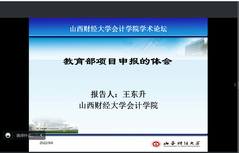 王东升副教授分享了教育部课题《双碳目标背景下资源型企业跨产业链转型的路径和策略研究:基于机会资源一体化视角》的申报体会。主要从以下五点展开讨论:(1)自我认知:科学研究首先要清晰定位“我是谁”,做不甘于平庸的平凡人和科研领域崭新的老兵;(2)申报历程:王东升副教授谈到自己经历5年坚持不断地申报,4年失败,最终在今年成功申报教育部项目《双碳目标背景下资源型企业跨产业链转型的路径和策略研究:基于机会资源一体化视角》;(3)申报反思:申报不止有成功的经验,失败的经验更值得反思和总结。王东升副教授谈到,申报课题要联系时代背景,追踪热点问题,因此需要认真学习党和政府的重要文件和讲话精神,不能过于固执和坚持,同样不能选择过气的学术热点。采用疑问语气进行申报更像是一篇期刊论文,采用双案例研究的方法则不易被财务界认可。此外,注意写作要规范,不能只停留在简单分析,没有大样本的实证研究很难被认可;(4)课题申报中的图形经验:图形要复杂而清晰,最好能揭示悖论和双向机制。课题项目的图形至少包括研究内容图和研究思路图。研究思路范式包括:阶段——内容——方法、是什么——为什么——怎么办、提出问题——分析问题——解决问题三方面的技术路线;(5)案例研究的不易:案例研究存在实践调研难、理论抽象难、论文发表难三个困境。案例研究的过程包括将现象概念化,将概念理论化,将理论系统化,成功的案例研究需要不断试误的过程,因此教训多于经验。做研究要勤奋和执着,坚守初心,方得始终,成功与否均有收获。