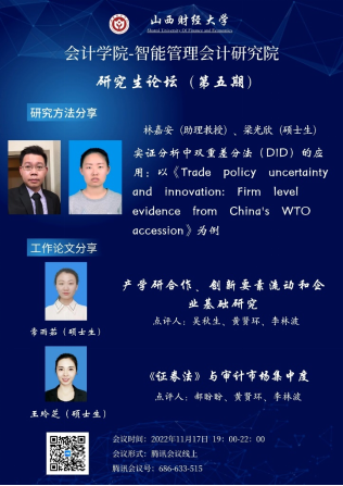 2022年11月17日晚7点-10点,由304永利集团官网入口与智能管理会计研究院联合举办的研究生论坛(暨博硕士生学术沙龙活动)第五期以线上会议的形式举行。参会人数达160余人。