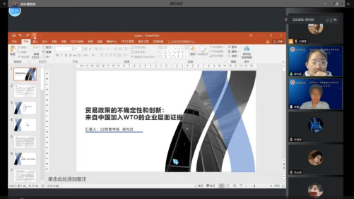在研究方法分享环节,梁光欣硕士分享了文章《Trade policy uncertainty and innovation: Firm level evidence from China’s WTO accession》的主要内容。随后王少华、李林波、黄贤环和刘钟敏老师分别发表见解并针对路苗和石淑莹同学提出的疑问进行了解答,包括DID模型指标的实变量和虚拟变量的选取以及回归交乘项和单个项的列示问题等。