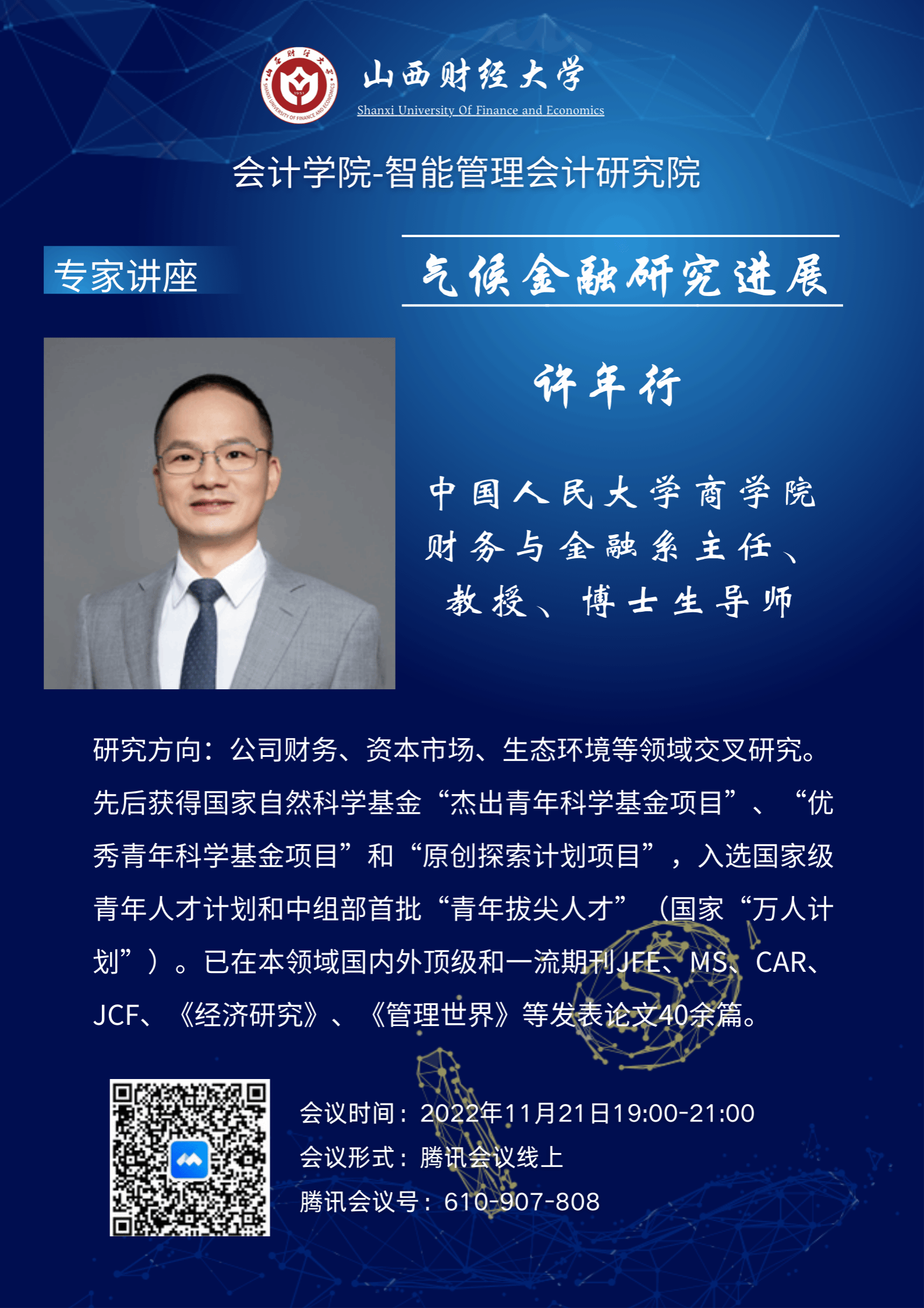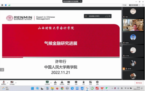 2022年11月21日晚上7:00-9:30点,304永利集团官网入口-智能管理会计研究院以线上会议的形式邀请了中国人民大学许年行教授做专题讲座。许教授的报告题目为《气候金融研究进展》。