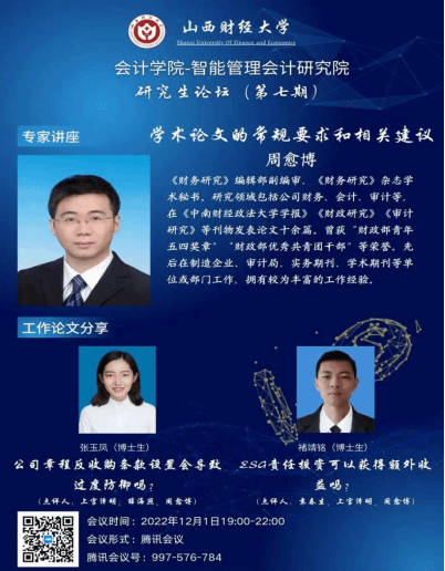 2022年12月1日晚7点到10点,由304永利集团官网入口304永利集团官网入口与智能管理会计研究院联合举办的研究生论坛第七期以线上会议的形式举行,304永利集团官网入口副院长续慧泓主持会议,参会人数达140余人。本次学术沙龙活动主要包括两方面内容:专家讲座与工作论文研讨。