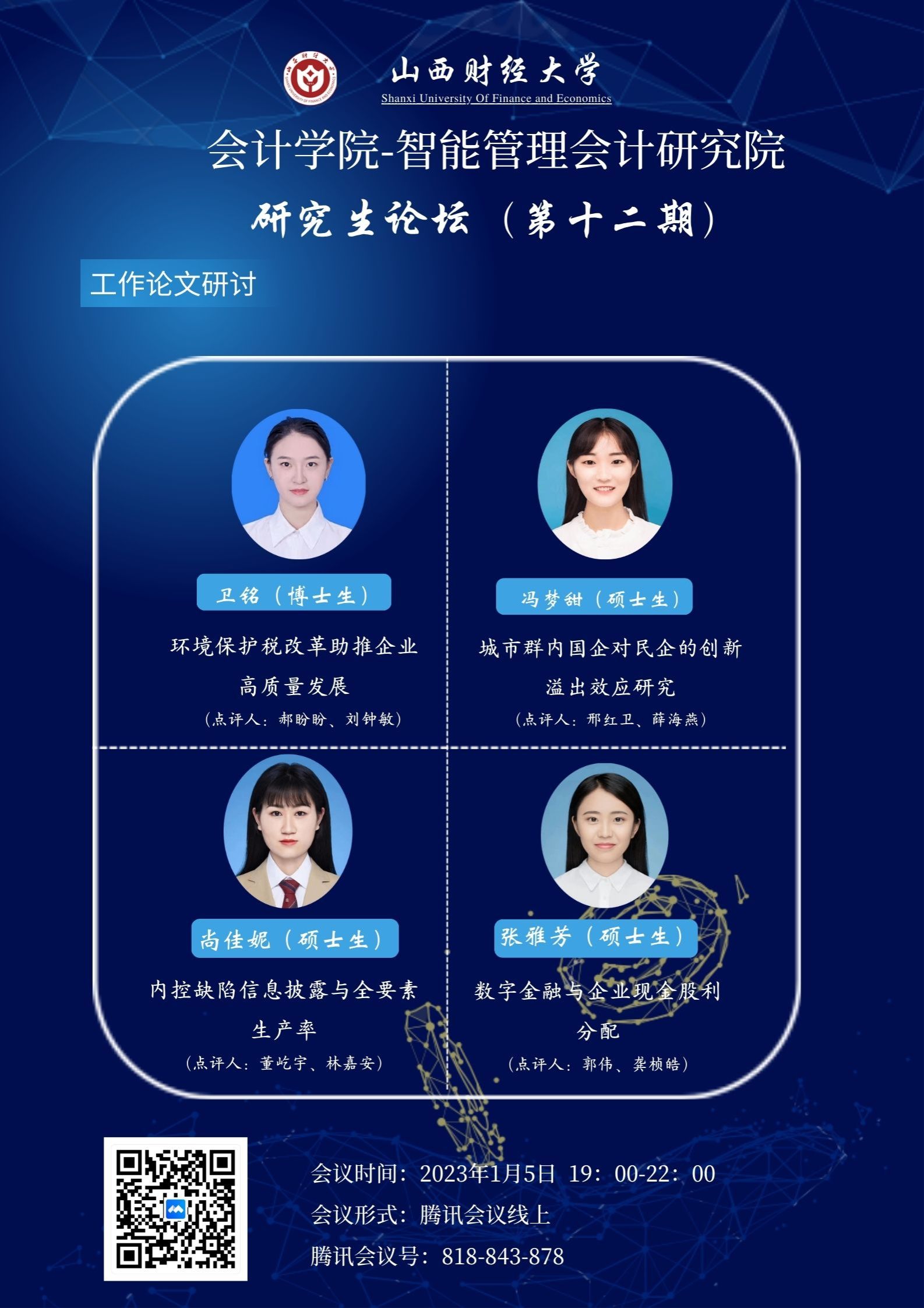 2023年1月5日晚7:00至9:30,由304永利集团官网入口与智能管理会计研究院联合举办的研究生论坛第十二期以线上会议的形式举行。会议由李颖教授主持。参会人数达八十余人。本次学术沙龙活动研讨了四篇工作论文。