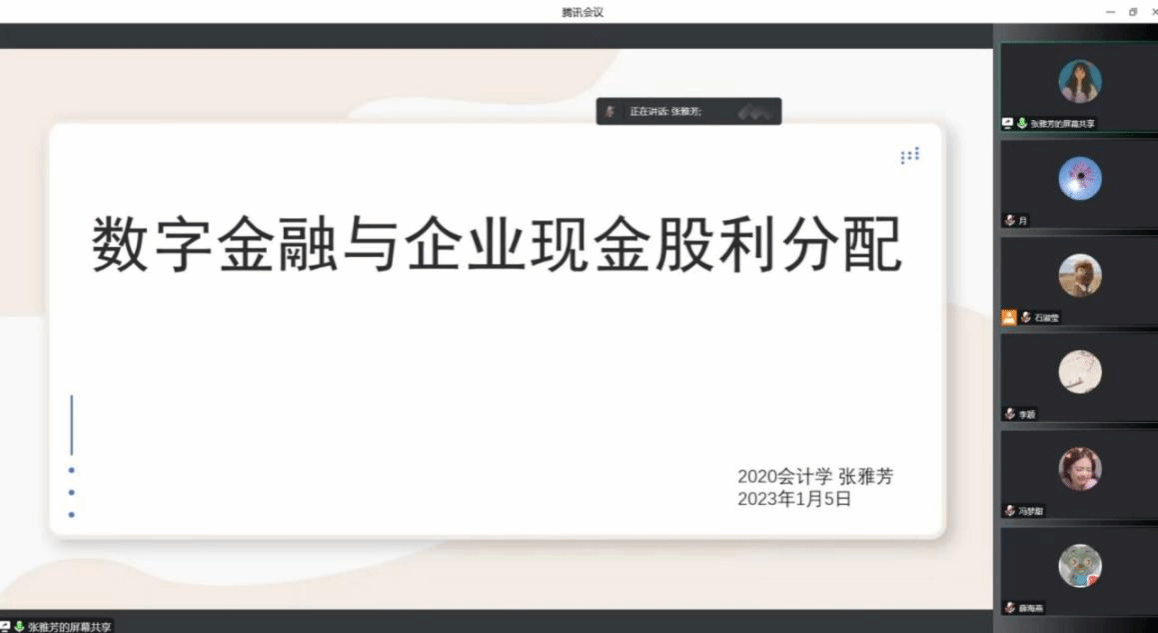 张雅芳硕士分享工作论文《数字金融与企业现金股利分配》。郭伟老师从整体来看,认为文章内容比较丰富,但是语言表达需要更加学术化,内容需进一步规范凝练。具体来看,摘要部分表述不清;文献综述部分文献选取陈旧;研究假设部分理论分析不明晰,层次不鲜明;研究设计部分混乱;控制变量设置不足等。龚桢皓老师建议重新明确标题,增加省份因素的控制变量,进一步考虑工具变量的有效性,并针对融资约束衡量方式提供参考文献。