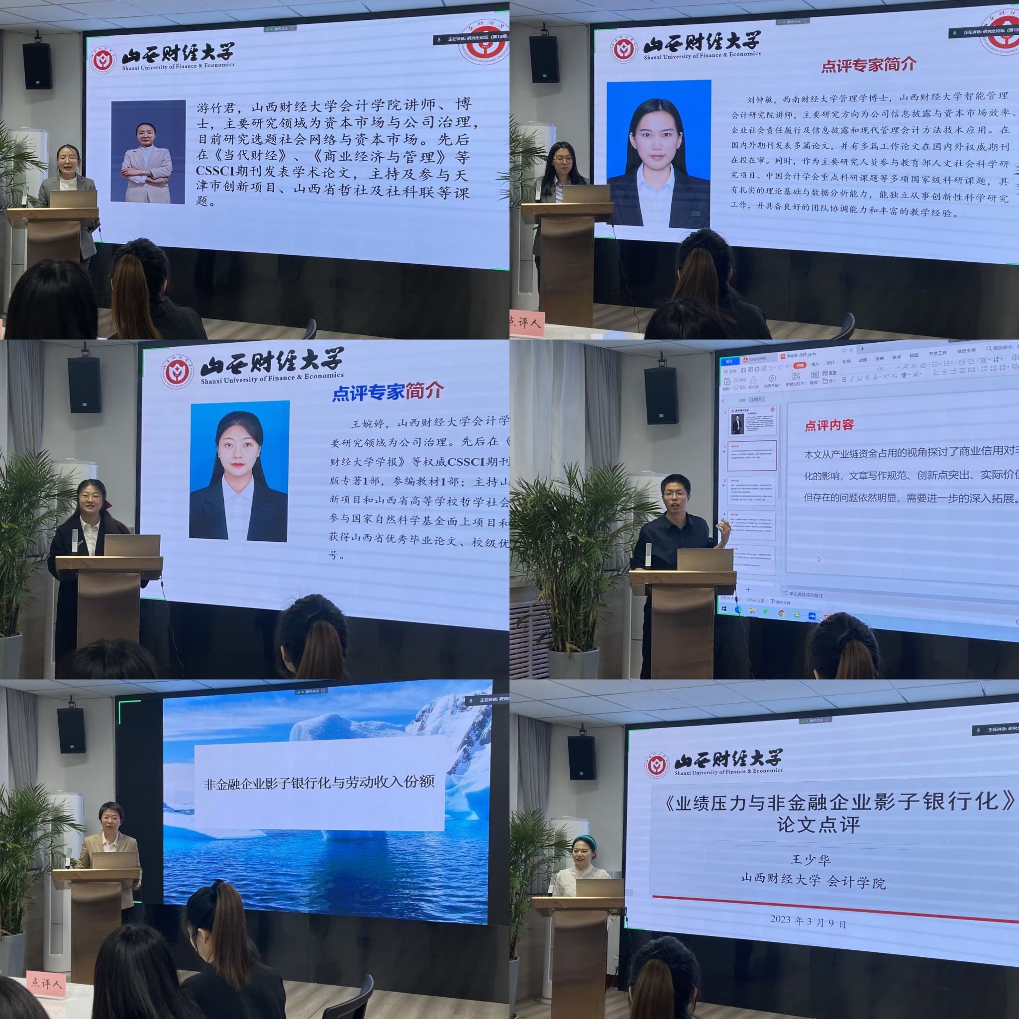 硕士生刘亚汇报了工作论文《业绩压力与非金融企业影子银行化》,王少华和刘钟敏两位老师进行了点评。王少华老师指出:论文题目的表述有待商榷;文献综述梳理不够明晰;最好能够再设计实证对另一个竞争性假设进行排除;业绩压力变量度量的合理性有待商榷;理论框架结构还可再优化;政策建议或研究启示应当基于论文的研究内容和结论出发;两个模型系数应做区分;全文样本量应保持一致。刘钟敏老师认为:文章内在假设为高管具有薪酬业绩敏感性,可做PPS检验;解释变量也偏后果性,应多做内生性检验;分组检验组间样本量差异太大;控制变量缺乏,可补充高管特征等变量进行控制。