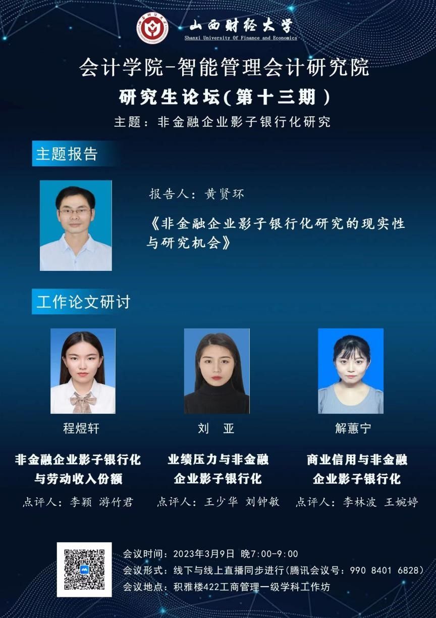2023年3月9日晚7点到10点,由304永利集团官网入口与智能管理会计研究院联合举办的研究生论坛(第十三期)以线下及线上两种形式同步举行。本次学术论坛的主题为“非金融企业影子银行化”。本期论坛的轮值主持人为黄贤环副教授。