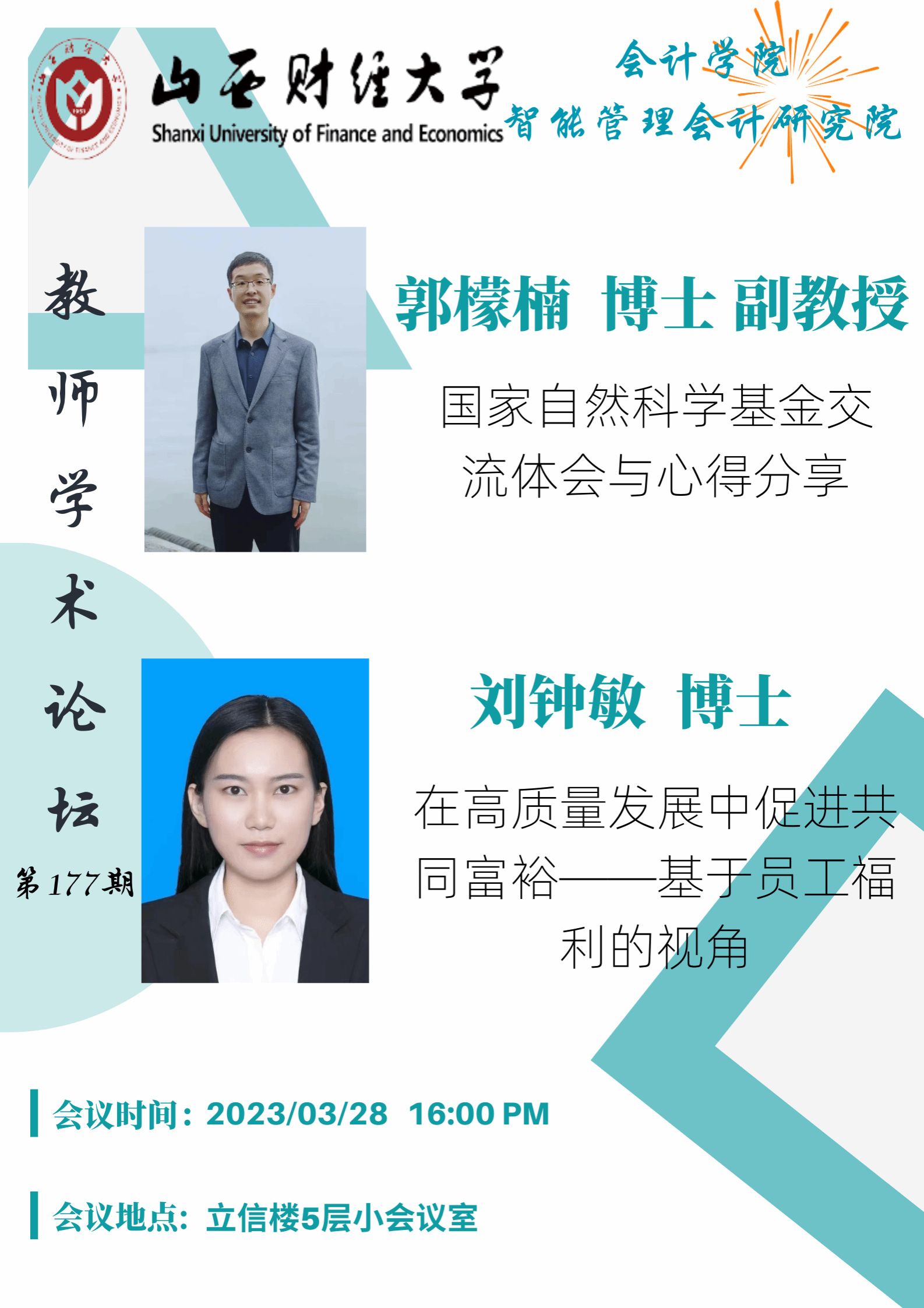 2023年3月28日下午,304永利集团官网入口与智能管理会计研究院联合举行了第177次学术论坛。本次论坛主要内容包括两项内容:郭檬楠老师汇报国家自然科学基金交流体会与心得分享;刘钟敏老师汇报国家项目情况。