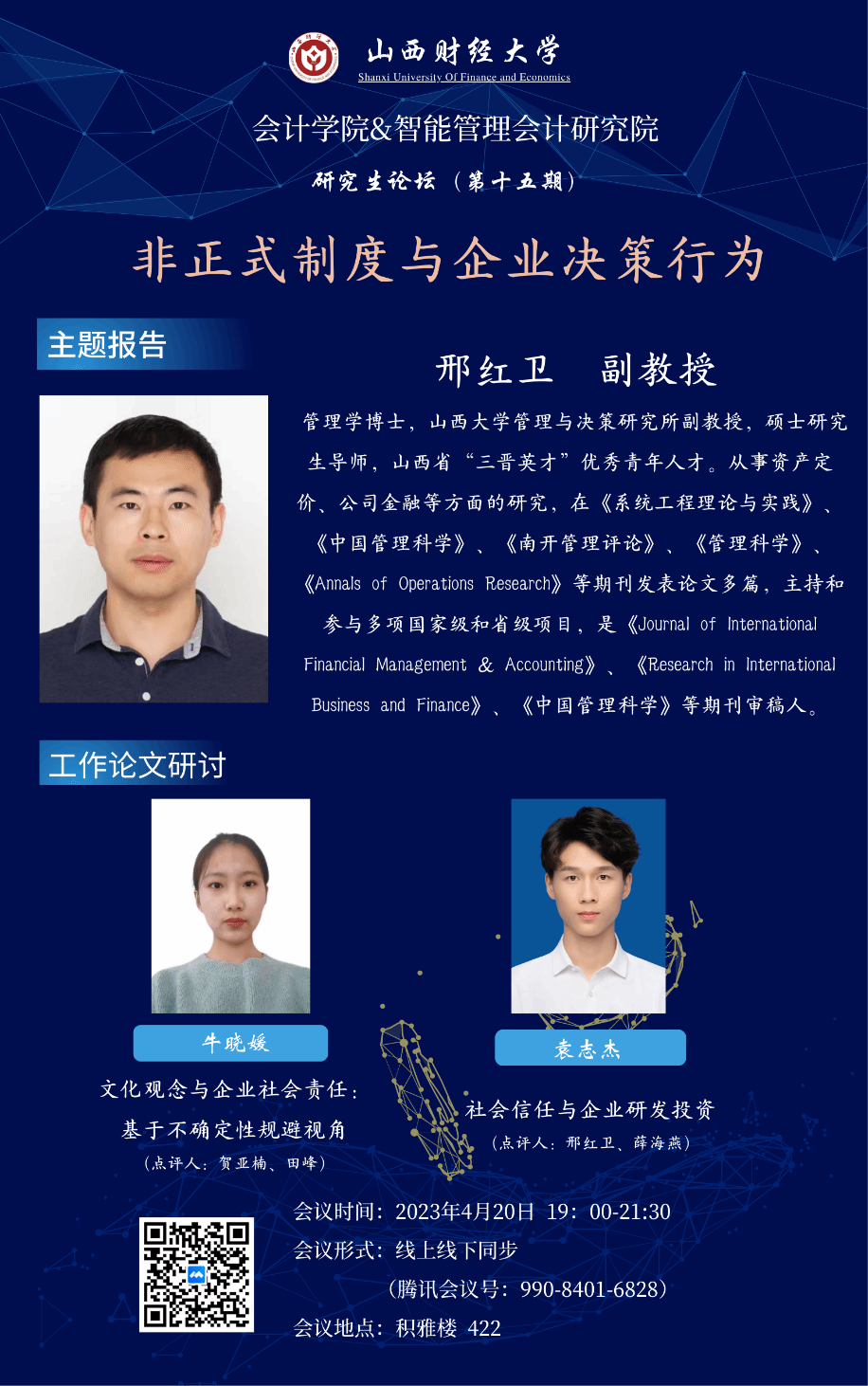 2023年4月20日晚7点至9点半,由304永利集团官网入口与智能管理会计研究院联合举办的研究生论坛(第十五期)以线下线上两种方式同步举行。本次学术论坛的主题为“非正式制度与企业决策行为”,轮值主持人为智能与成本管理教研室主任贺亚楠副教授、副主任田峰博士,论坛特别邀请山西大学管理与决策研究所邢红卫副教授做主题报告。