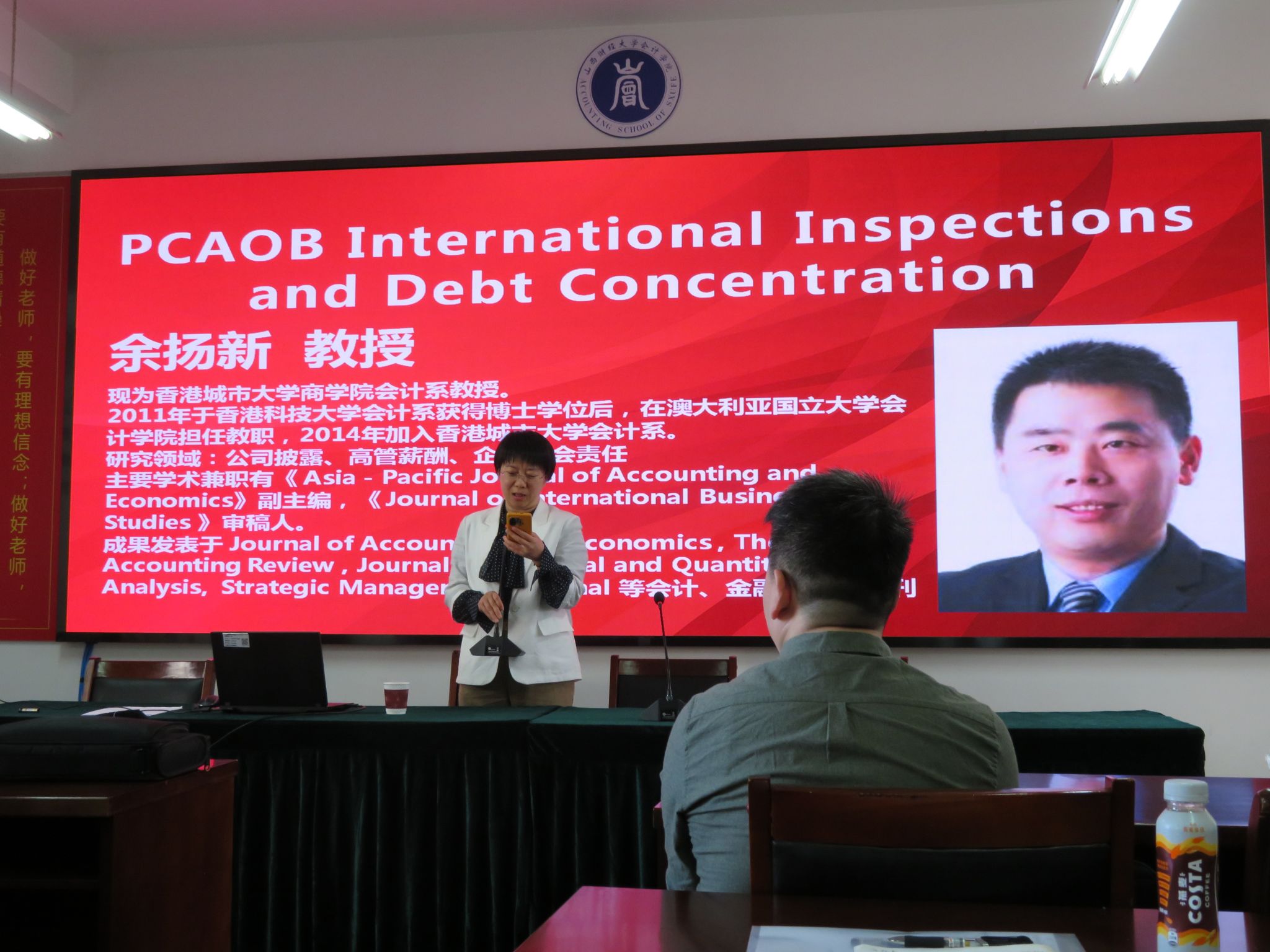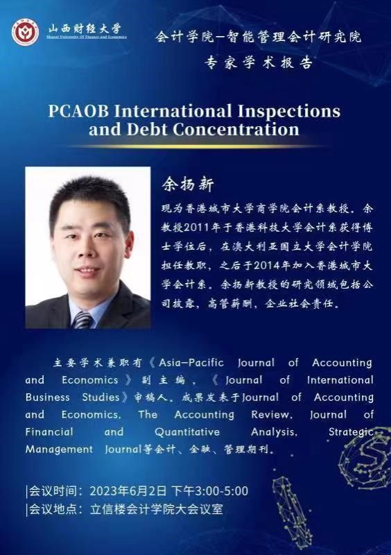 2023年6月2日下午,304永利集团官网入口与智能管理会计研究院联合举行学术名家论坛,特邀香港城市大学教授余扬新做学术报告《PCAOB International Inspections and Debt Concentration》,学院科研骨干及博硕士生积极参与。