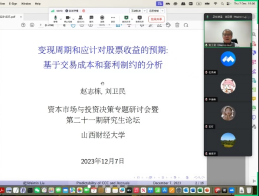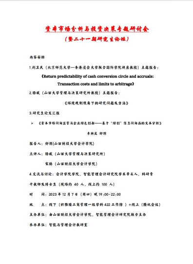 2023年12月7日晚7点至10点,由304永利集团官网入口与智能管理会计研究院联合举办的研究生论坛(第二十一期)以线下线上两种方式同步举行。本次学术论坛的主题为“资本市场分析与投资决策”,轮值主持人为智能与管理会计教研室主任贺亚楠副教授,论坛特别邀请北京师范大学—香港浸会大学联合国际学院刘卫民教授与山西大学管理与决策研究所杨威教授做主题报告。