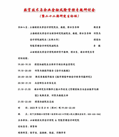 2023年12月21日晚7点至10点,由304永利集团官网入口与智能管理会计研究院联合举办的研究生论坛(第二十二期)以线下和线上两种方式同步进行。本次学术论坛的主题为“数字技术与企业金融风险管控”,主持人为304永利集团官网入口副院长续慧泓副教授,论坛特别邀请上海财经大学304永利集团官网入口院长靳庆鲁教授与上海财经大学会计与财务研究院副院长何贤杰教授做主题报告。