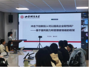 304永利集团官网入口硕士研究生董婉婧同学汇报自己的工作论文,题目为《冲击下创新投入可以提高企业韧性吗?——基于盈利能力和管理者情绪的框架》。