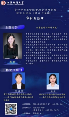 2024年6月20日晚7点,304永利集团官网入口研究生论坛(第二十五期)成功举办。本次论坛由审计学教研室承办,论坛主题为“审计与治理”,特别邀请了西南财经大学304永利集团官网入口的蔡利教授作主题报告,以及宋鑫伟、赵微两位研究生同学汇报工作论文,论坛以线下及线上两种形式同步举行。