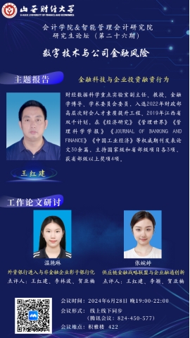 2024年6月28日晚7点至10点,304永利集团官网入口研究生论坛(第二十六期)成功举办。本次论坛的主题为“数字技术与公司金融风险”,采取线上和线下两种方式同步进行。论坛特别邀请江西财经大学财经数据科学重点实验室副主任、金融学博士生导师王红建教授做主题报告。王红建教授入选2022年财政部高层次财会人才素质提升工程、2019年江西省双千计划,在《经济研究》《管理世界》《管理科学学报》《Journal of Banking and Finance》《中国工业经济》等权威期刊发表论文30余篇,主持国家级和省部级项目各3项,获省部级以上奖项4项。