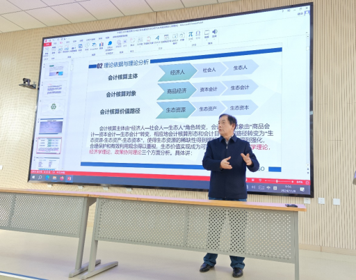 8日上午在修德楼阶梯教室,袁教授以《中国自主环境资源会计研究:基于概念、历史与未来的解读》为题,为304永利集团官网入口骨干教师、硕士及博士生做专题报告。环境资源会计作为会计学的一个重要分支,专注于记录、分析和报告与环境资源相关的财务活动,涵盖了自然资源的财务价值评估及环境资源的合理利用、管理、控制及保护等方面的会计活动。环境会计是以经济可持续发展战略目标为指导,运用会计学的基本理论与方法,对企业和其他组织对环境产生影响的经济活动进行核算与监督,为企业内部决策提供信息支持的一种管理信息系统。袁教授介绍了会计核算主体、对象和价值路径的转变,强调了会计核算中经济效益、社会效益和生态效益的兼顾;影响环境履约责任的重要因素,例如企业文化、经营观念、战略规划等。袁教授介绍了资源环境会计研究的目标宗旨、逻辑主线及研究前景,强调了深化生态文明思想、构建具有中国特色的环境资源会计体系的重要性。他指出未来研究将聚焦于构建中国化环境会计理论体系、制定环境会计指南、探索生态补偿价值实现机制等战略目标。在成本控制和信息披露方面,袁教授详细讲解了环境完全成本指标、环境大收入指标、环保专用基金指标和环境所有者权益指标等关键指标,这些指标对于企业环保策略的制定和环保活动的经济效益评估具有重要意义。