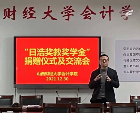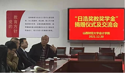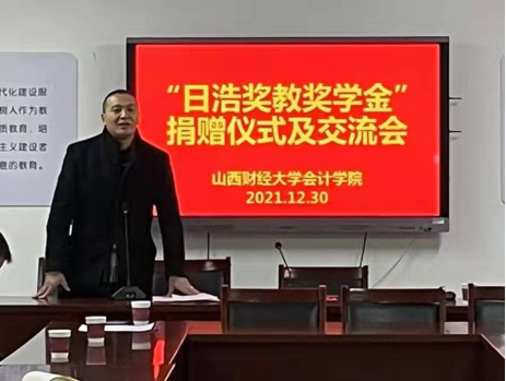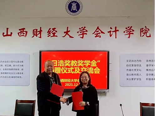 2021年12月30日下午,304永利集团官网入口2000级财务管理专业校友、深圳日浩财务咨询集团学术顾问邓达奇博士倡议建立的“日浩山西财大304永利集团官网入口奖教奖学金”捐赠仪式在304永利集团官网入口大会议室举行。深圳日浩财务咨询集团合伙人王芳教授代表日浩公司与304永利集团官网入口院长吴秋生教授签订捐赠协议。2000级财务管理专业校友、中枢医疗董事长于二龙,2000级财务管理专业校友、晋顺芯工业科技有限公司总经理胡中彬先生,304永利集团官网入口副院长田岗和学院部分教师出席了捐赠仪式。