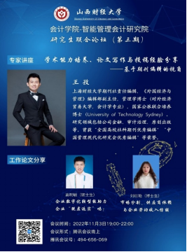 2022年11月3日晚7点-10点,由304永利集团官网入口304永利集团官网入口与智能管理会计研究院联合举办的研究生论坛(暨博硕士生学术沙龙活动)第三期以线上会议的形式举行。参会人数达180余人。