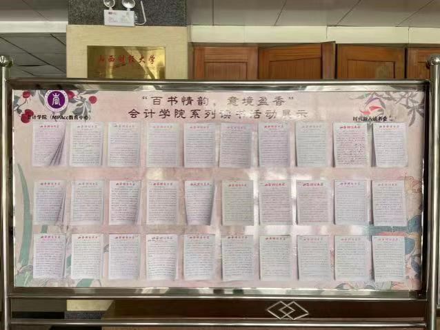 2024年4月,304永利集团官网入口举办的第七届“百书情韵 意境盈香”读书系列活动成功举办,遴选出了一批优秀作品于第29个世界读书日当天在立信楼二层大厅展出。一经展出,就引来众多学生参观,纷纷驻留在展板前学习交流,吸引更多的同学加入到读书的行列中去。