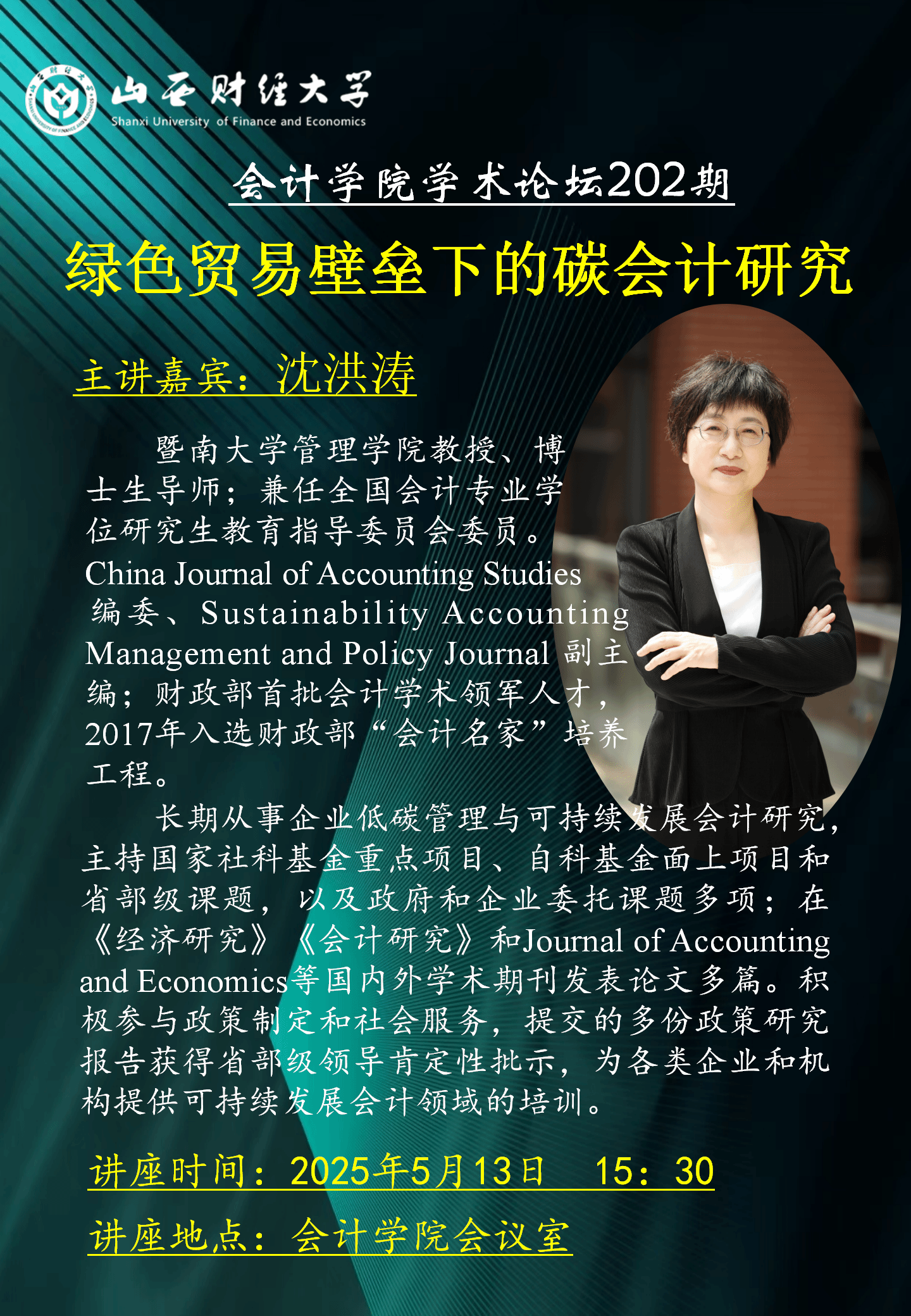 2025年5月13日,304永利集团官网入口邀请我国环境资源会计领域专家、暨南大学管理学院沈洪涛教授进行学术交流。沈教授是中国会计学会环境资源会计专业委员会委员,兼任全国会计专业学位研究生教育指导委员会委员,长期从事企业低碳管理与可持续发展会计研究,先后主持国家社科基金重点项目、自科基金面上项目,在《经济研究》等国内外学术期刊发表论文多篇。
